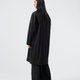 布料具有特殊质感纹理,运用于大衣版型,透过宽、大轮廓,与西装领的结合,完整呈现布料特殊质感之气势。