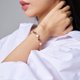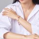 在粉色柔光与金色纹理交错的瞬间,妳的风格悄然绽放。 《粉漾光斓手链》以圆形粉色元素与不规则金色饰片交错排列,展现出柔美与个性兼具的设计语言。 每一颗粉色皆经精致包镶,剔透光泽如晨曦微光,搭配可调式链身与品牌刻印吊牌,细节之处尽显质感。