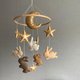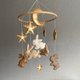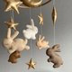 Original decor item includes 5 bunnys,1 moon and 5 stars made of artificial leather, high quality felt, cotton cord on a wood ring. A very cot felt bunny mobile in calming, dreamy brown colors a lovely addition to a nursery.