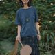 深海藍 天絲漢麻毛邊上衣 寬松小口袋藍色細條短袖T恤
