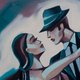 探戈》这幅画是一个充满激情和优雅的世界。在一幅巨大的画布上,描绘了一对情侣,他们仿佛陷入了情感的旋涡,沉浸在舞蹈中,这是两个灵魂结合的缩影。女子身着剪裁华丽的礼服,她的腿轻轻地缠绕在伴侣的腿上,一颦一笑都充满了性感和优雅。男子身着经典西装,头戴时尚礼帽,在她背后搀扶着她,营造出一种自信可靠的氛围。