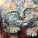 风格属于表现当代的具象艺术,运用自由、动态的笔触感油画棒线条。猫咪半阖的双眼与放松的姿态,唤起一种安全、休憩与静默观察的感觉。