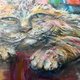 “色彩的宁静守护者”是一幅原创油画棒画作,描绘了一只栖息中的猫咪,沉浸在充满活力、色彩与笔触交织的画意世界中。猫咪神情宁静且内省,散发着温暖、信任与沉静的力量。