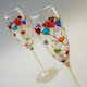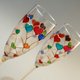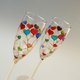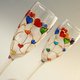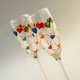 Set of 2 hand-painted champagne glasses. Rainbow hearts design. Gold-brass lines and colorful hearts in different sizes. Soft goldy matt effect. Charming glasses, READY to SHIP!