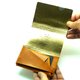 采用比一般皮革更费工夫的制程,日本职人利用植物来源材料鞣制的皮革的毛面(※)上加工贴附金箔。不论是商务或休闲用途,这种配色都很好搭配,打开皮夹时,闪耀的黄金色泽会带来一股华丽的气氛。使用得越久,就越会显露出深厚的色调,逐渐转变成具有您专属个人风格的皮革,相信这也会使您更加地爱护它吧。虽然焦糖色的色泽不会有什么变化,但它的光泽会变得愈益明显,让您能够欣赏到它更加有深度的色泽。另外,我们故意在金属箔片比较容易剥落的毛面上加工,经年累月以后,金属箔片也会稍微有所剥落,让您能感受到一种类似骨董金银工艺品的雅趣。※毛面=皮革带有少许绒毛的背面部分。
