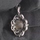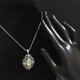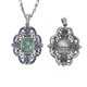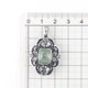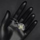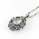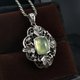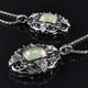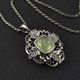 结合了天然葡萄石与精美的纯银设计,呈现出独特的高雅气质和自然美感。镶嵌一颗抛光的葡萄石,颜色为柔和半透明的浅绿色,不同角度下可见天然宝石独有的内含物。周围环绕着橡树叶浮雕,衬托于镂空的蕾丝花纹的结构设计,呈现出古典和现代的完美融合。
