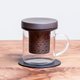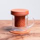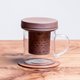 设计上将传统的陶器及陶色与玻璃杯结合,泡茶时可以观赏玻璃杯中的茶色,