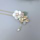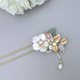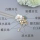 簪花材料:白蝶贝花、粉蝶贝花、捷克蚀刻琉璃花瓣、白玉铃兰、淡水真珠、白蝶贝珠、东陵玉叶、锆石花心