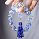 链身以珐琅**金刚杵**(象征**智慧、正能量**)点缀,主坠以**蝙蝠(福气)如意**珐琅佐星光海蓝宝**古钱(平安扣)**、帝王青青金石编制流苏。