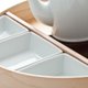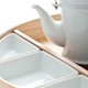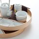 将茶盘与点心盘两者透过蒸笼的概念结合,在茶盘中可搭配碟子作为点心盘使用,或是单纯做为托盘使用,所以茶点与茶壶的摆设更具有一致性,也把蒸笼堆叠的方式加入设计之中,使得茶盘与茶盘之间收纳更方便。