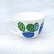 A cobalt blue cup and saucer with a humorously deformed persimmon design.