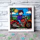 这幅画"红色摩托车上的猫"是一个系列,可爱的动物过着他们最好的生活。 它在有机玻璃上涂有彩色玻璃涂料,因此在运输过程中不会损坏,可以安全地放置在儿童房中。