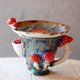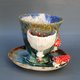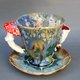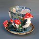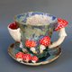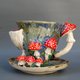 不寻常的手工茶具。明亮的杯子和碟子,带有飞木耳蘑菇形状的立体装饰。杯子有一个口袋,可放置茶包。一个小碟子可以用作盖子,以便茶煮得更好。这些物品是用瓷器模制而成的。覆盖着多彩的食物釉。功能齐全,就像普通炊具一样。单份。