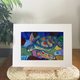 这是一幅以抽象方式表现的海龟作品,所有生物的颜色皆为想像构成,呈现充满幻想的画面。海龟正慢慢滑行游过珊瑚礁群,珊瑚美丽的颜色蔓延到它的身上,将它的鳍足和背甲染成彩虹般的光芒,像闪闪发光的宝石。海洋中的万物生活分享着五彩缤纷的世界,丰盛的自然生态象征海洋的完整、健康。当你在清澈蓝绿色水面下游泳时,您将会为海洋世界感到无比惊奇,所有的色泽、型态都如此丰富、多变,远远超乎我们的想像力。
