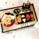 5.乌龙面寿司套餐:炸虾、鱼板、温泉蛋、海苔片、面条、汤汁、寿司米(及翻模)、鱼卵、花枝、鲔鱼