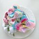 使用韩国进口的亮彩卷边欧根纱带,折成、交叠成立体的蝴蝶结;上面再加上花边织带、合金吊饰和流苏,轻盈又立体可爱的儿童发夹如是完成~