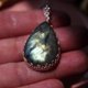 神奇的拉长石,从不同角度观看,会闪耀着彩虹光芒。钙钠斜长石的特征就是那美丽闪耀的光泽及神秘深冷的寒光,像宇宙之光,因此也被称为是[象征月亮和太阳之石] .