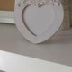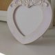 A heart-shaped photo frame in light gray color with a ornament tinted with gold paint.