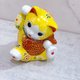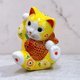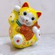 招财猫以黄色瓷器为基底,彩绘多色图案,包括黑色、红色、橙色与绿色。