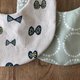 A reversible bib that combines cute printed cotton fabric and embroidered gauze fabric.