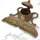 这个黄铜墨水笔座优雅地重现了法兰西帝国风格,由抛光黄铜制成,带有浮雕装饰。墨水座带有上盖,前面可以放钢笔或墨水笔,坚固耐用,它为您的书房或办公室增添一抹复古气息。状况非常好,可以放在办公桌上显眼处,玄关的家具上,如有需要也可用作烟灰缸。