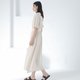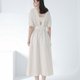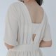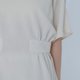 - 弧形领口连袖造型、宽腰剪接细褶、后衣身三角镂空设计、后开隐形拉链。