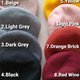 red wine ,Brick orange, beige, khaki, light pink, yellow