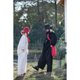 松紧腰出抽绳,用一根小花花的织带,正好也是黑与白的配色,点晴之笔,又怀旧又时髦,也不失女性的可爱在内,将她塞理腰头也并破黑色的沉寂感。两侧有袋,后片也有,中性的袋口,再放一粒破坏式的不规则纽扣。