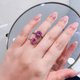 这枚戒指选用天然粉红蓝宝石,中央椭圆形主石被八颗圆形粉蓝宝精心环绕,排列成一圈盛放的花冠。外围镶嵌细致白钻,勾勒出层次分明的花瓣轮廓。