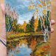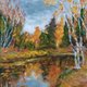 这幅充满活力的油画捕捉了宁静的秋季景致,一条静谧的河流映照着河岸边金黄的树叶。丰富的黄色、橘色和温暖的绿色调,透过富有表现力的纹理笔触交织融合,营造出温暖的秋日氛围。