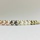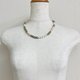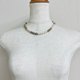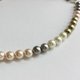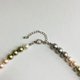 此款为日本制玻璃珍珠项链,选用玻璃作为基底,并于其上涂覆自家原创珍珠漆料,层层堆叠出细腻质感。其特色在于温润的光泽感,随机不规则地排列着卡其绿、粉红、白色及紫灰色四种色彩。珍珠尺寸约为直径8mm,全长约43cm,属于标准的公主项链长度。坠饰末端配有延长链,可额外延伸约5cm。