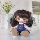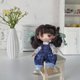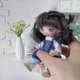 This little handmade rag doll has dark hair, a light blouse, a blue jumpsuit with a pocket and blue bows in her hair.