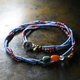 这是一款串联了复古藏传绿松石、掸族玛瑙、古老水晶、古董泽尼蓝种子珠、鎏金红白色心形琉璃珠等的双链项链。