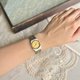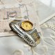 女装的Celine 凯旋门石英手表,斜度圆形金银表壳,线状时标,设有日历,简约精致,配上金银钢表带,不怕太斯文难衬衫。表带扣刻有经典凯旋门标志,更加典雅。