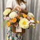 作品名字的意思是the basket of May——五月花篮,刻意用上Little Twins Stars色的厄瓜多尔尔尔玫瑰及五月的标志性花儿:芍药来当主花,配搭复古粉色康乃馨、淡橙小玫瑰、粉色麝香及一些衬叶,完成这个柔美的花篮。图3可见捧在身上的尺寸。