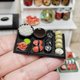 - Realistic set of sushi and rolls on one tray. On one board are several types of polymer clay sushi rolls, rice, soy sauce, ginger and wasabi. This is a realistic miniature for a dollhouse or collection. The whole composition is molded of polymer clay.
