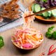 特选清脆爽口的青木瓜搭配微辣香甜的紫洋葱以及红萝卜,拌入清爽的柠檬汁、大蒜以及辣椒调制而成的微辣酸甜酱汁,做为夏日凉拌开胃菜,酸酸辣辣超开胃。