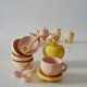 We invented colors and painted this set of dishes by hand. Ware wooden. Linden tree. Varnish safe.