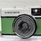 这是一台以清新浅绿色外观呈现的 Olympus Trip 35 复古胶片相机。