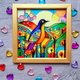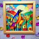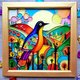 彩色玻璃画是一个奇怪的五彩鸟的图像,背景是一个充满明亮阳光的秋天森林。 这只鸟有一个明亮的羽毛结合各种颜色和色调,丰富的装饰与水钻和装饰,这给它一个特殊的异国情调。