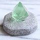 -美丽的上下颠倒金字塔晶体,迷蒙的透明绿色;萤石具有安稳情绪、转化、消融负性能量的功能;据记载,古埃及人常用萤石来雕刻甲虫当做护身符,个人觉得莹石本身结晶美得像是天使的血液结晶般,放在办公桌或工作桌上欣赏,也是增进灵感创作力的好伙伴-