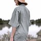 This basic shape dress shirt is in a very relaxing form. The length is just fine. Not too long not too short. Wearing it as a summer coat is a very creative idea. This boxy short sleeve shirt is always the designer's pick.