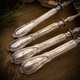 下面这款精美的四件组下午茶餐具组,年份大约1890年左右。这套精质的纯银餐具,手柄采用新艺术时期风格的植物曲线浮雕设计,餐具手柄颈部皆有法国纯银Minerva落款,餐具使用面上有品牌印记,材质是镀银,整体设计非常精致柔美,值得收藏使用。