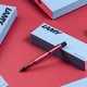 火红色铝合金烤漆笔身,黑色笔夹造型设计,半透明火红色人体工学三角前端握把,使用M16原子笔笔蕊