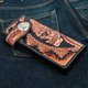 这款骑士长夹象征着美国印第安战士的勇气与自由。细腻手工雕刻的骨鳞与羽冠图案呈现传统与精神。采用优质真皮制作,使用后会产生独特的歲月光泽。附有坚固的银色按执与925银银钾环,可挂上链来,出行更加安全。内部设计宽敞,有卡片插槽与拉链内袋,兼具实用与美感。