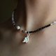 结合水铸工艺制作形似于环抱双脚侧坐的人像,铸造成纯银吊坠,再与手工自制银件搭配成为风格独特的矿石项链。