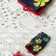 • 70年代复古风格眼镜包,适合收纳眼镜、小型化妆品或其他各式杂物。包身印有色彩鲜艳的花卉图案,内衬为干净的红色。