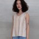 剪裁俐落的V领无袖背心,有着前中包缝与两侧下摆开衩等细节设计,两色棉麻条纹面料,穿着舒适透气、配色清新活泼,不论搭配同材质或牛仔下身单品,都能替简约的春夏穿搭增添一抹光彩。