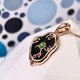 天然黑玛瑙时钟形吊坠连项链配绿色蛋面翡翠及白钻石,绿色蛋面翡翠直径长2.0毫米,阔1.8毫米,重0.065克,镶18K玫瑰金(1.49克),颈项长度38-44厘米,总长44厘米 ; 吊坠总长23.6毫米,阔12.0毫米。