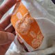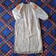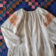 推测为1940至1960年代、乌克兰北方 Chernihiv 地区的全手缝连身衣,结合三种不同厚度的布料: 肩部的机织细致亚麻布 - 上身的漂白薄手织大麻纤维 - 下身的厚手织大麻纤维。清新橘色反白细致十字绣花、下摆灰黑交错的刺绣饰边,带着鲜活趣味感